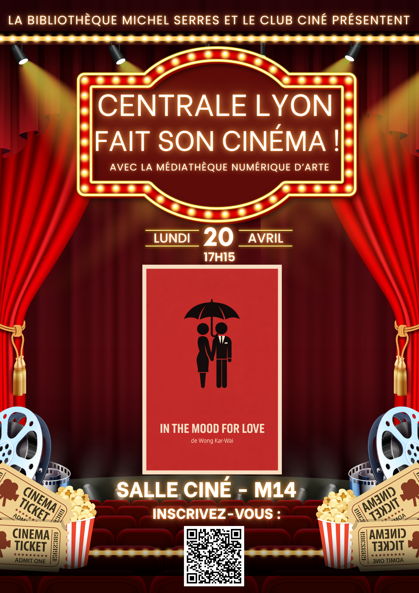 La deuxième session est déjà programmée pour le lundi 20 avril, à 17h15, toujours dans la salle ciné du bâtiment M14/M16. Le film, In the Mood for Love, sera présenté cette fois-ci par le club ciné de Centrale Lyon. Popcorn, snacks et boissons seront de nouveau offerts et nous dévoilerons en ouverture de cette deuxième séance la suite de la programmation 2026 – venez nombreux !